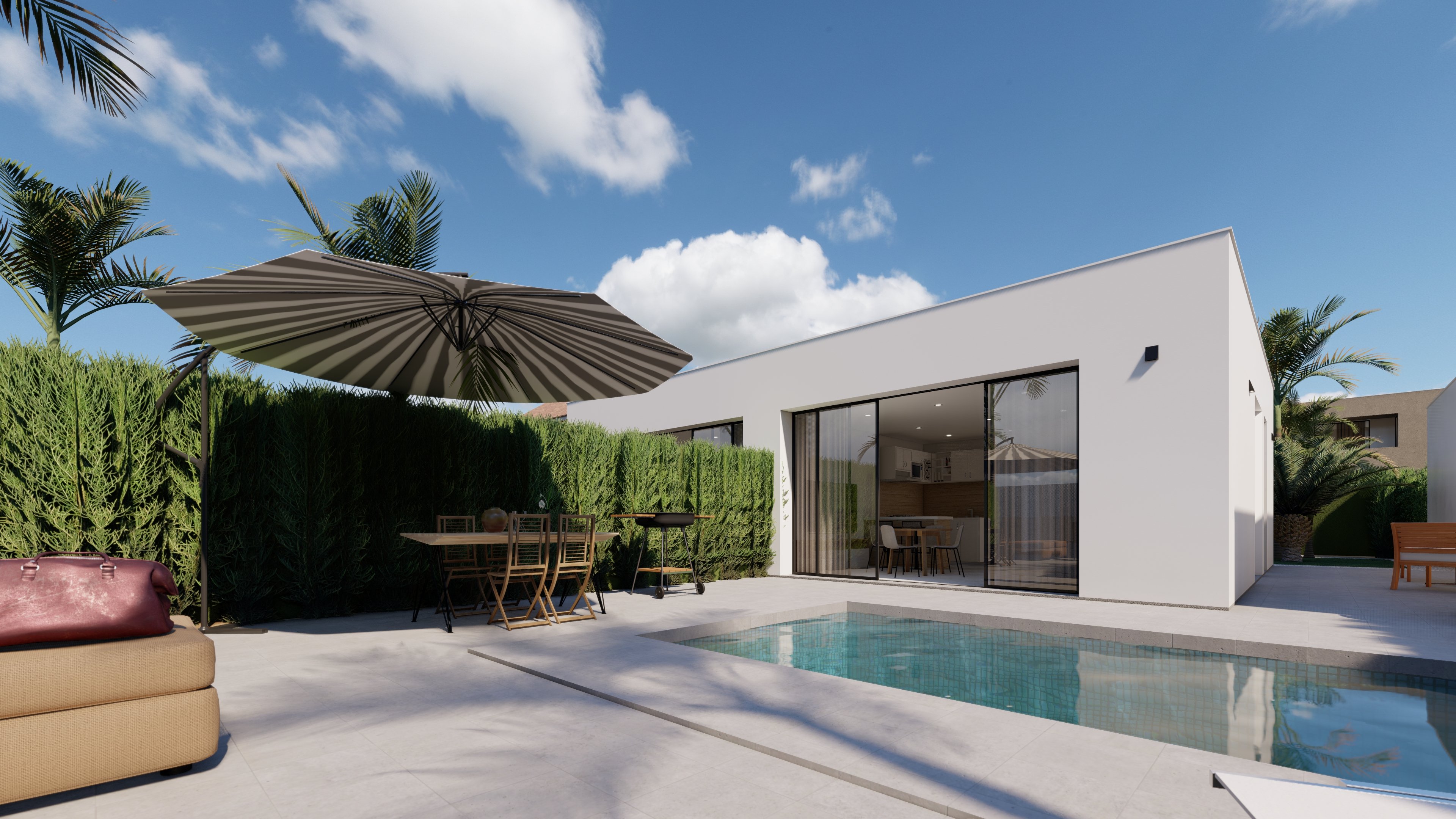 The exteriors of these independent homes in Murcia are designed to offer a space for relaxation and outdoor enjoyment. Each property features a private garden, perfect for family activities or simply enjoying the Mediterranean climate. Additionally, the terraces provide extra space for leisure, allowing you to enjoy the views and natural surroundings. The inclusion of a private pool in each home adds a touch of luxury and exclusivity, turning the home into a personal oasis.