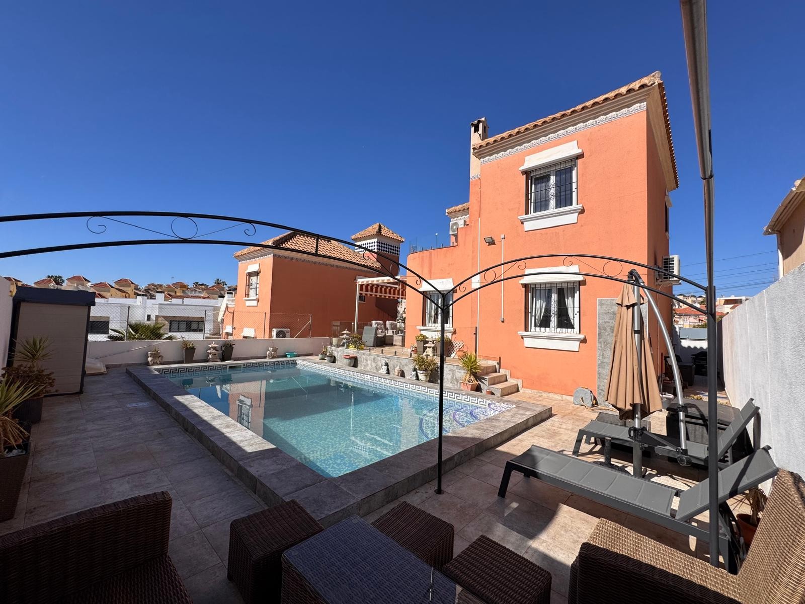 This beautiful south-facing detached villa is set on a 300 m² plot and offers a large private pool along with ample outdoor space, perfect for relaxing, entertaining, and enjoying both summer and winter evenings. The property is full of character and provides generous exterior areas ideal for outdoor dining and leisure.