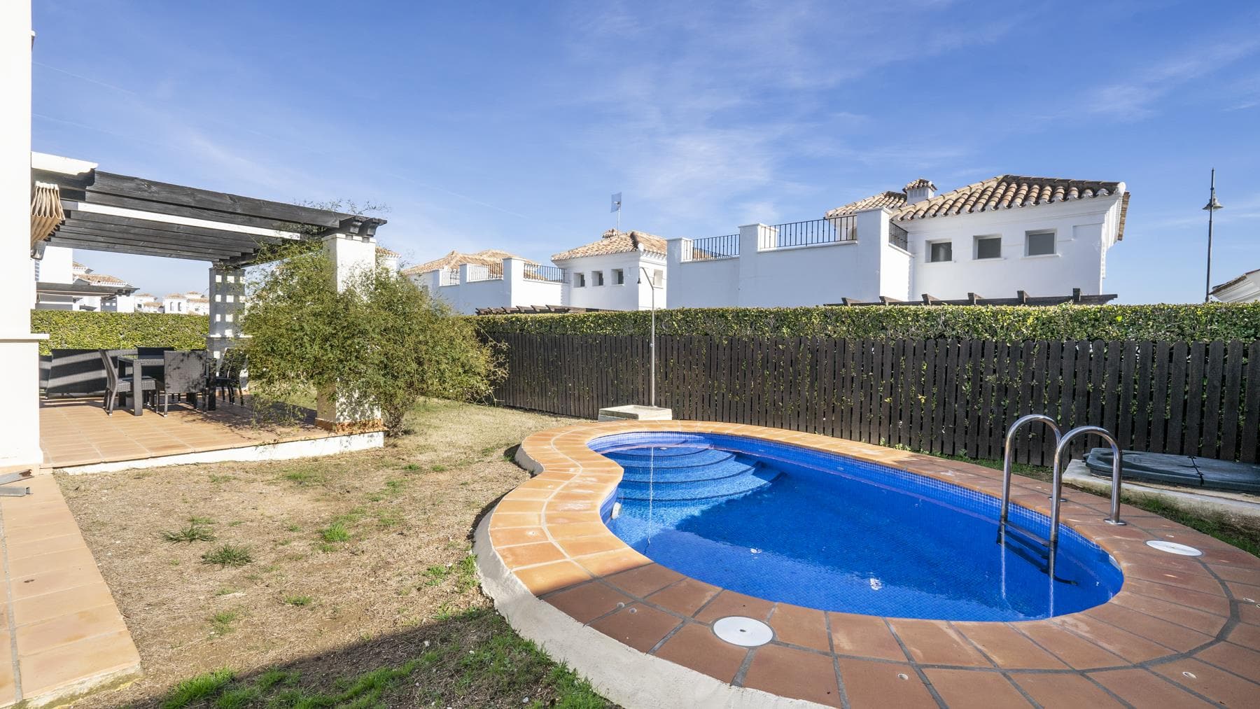 Large garden surrounding a private pool, perfect for outdoor relaxation and entertaining.