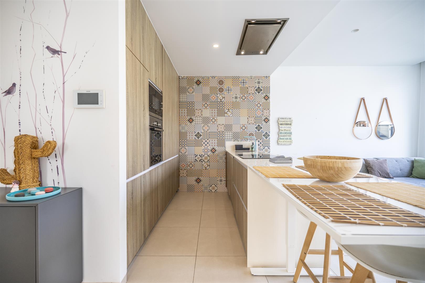 The kitchen is open plan and has a breakfast bar.